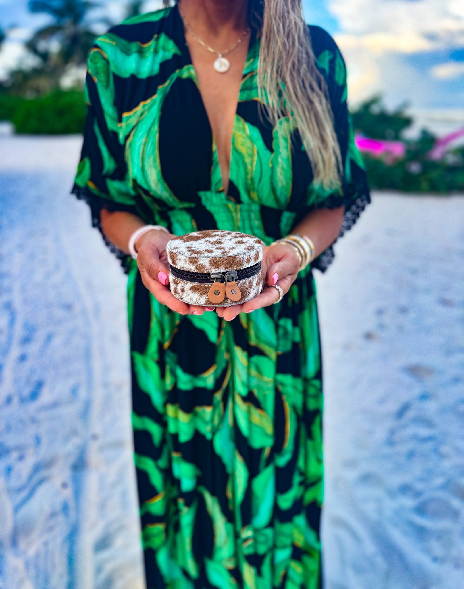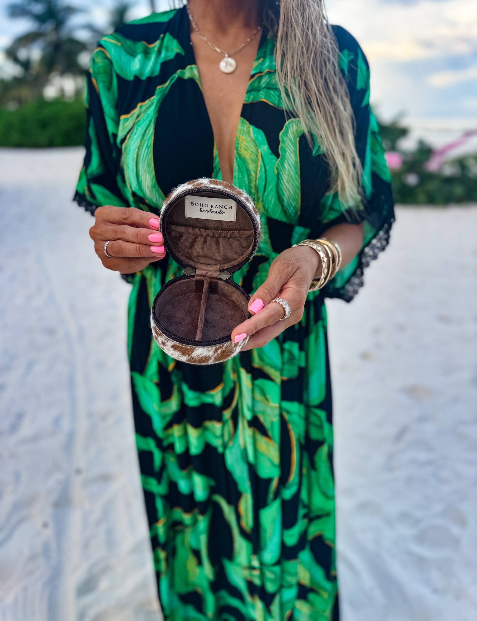 These mini round jewelry boxes are so cute and are great for travel or a statement piece on your vanity/ dresser. They hold rings, bracelets, earrings and necklaces! These also make GREAT gifts! 🎁 approximate size 3.5” Thickness: 2” Genuine cowhide Genuine leather Zippered closure PLEASE NOTE** Please note that cowhide will be different on each of these as there are no 2 cowhides that are alike. Genuine cowhide patterns will always be unique/ one of a kind. 💕