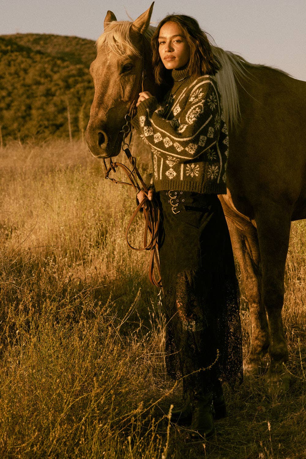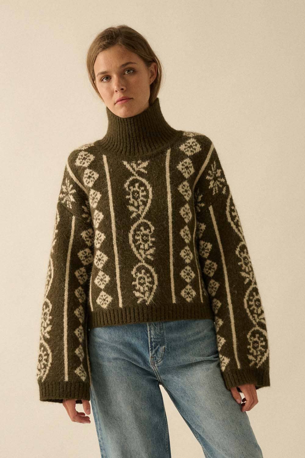 A fuzzy jacquard-knit patterned sweater with the following features: Abstract floral and snowflake patterns throughout. High mock neckline. Wide long sleeves. Drop shoulder. Ribbed collar, cuffs, and hem. Relaxed fit. Model Info: Height: 5 ft 11 in | Bust: 32 in | Waist: 25 in | Hips: 35 in | Wearing Size S.