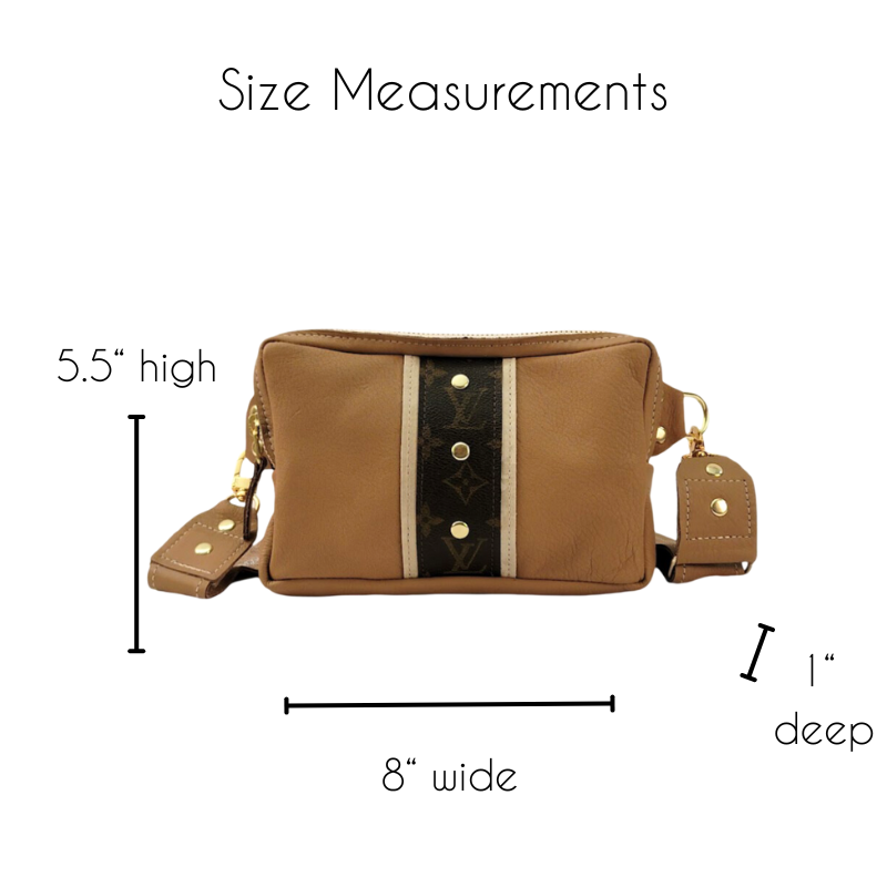 Stay ahead of the fashion curve with the Bailey Belt Bag, a must-have accessory featured on all the top fashion blogs and runways. * Authentic LV Upcycled Designer Canvas: Made from genuine upcycled LV canvas, this belt bag is a unique and sustainable fashion statement. * Premium Top Grain Leather: Crafted with high-quality top grain leather, ensuring durability and a luxurious feel. * Classic Style: A timeless design that complements any outfit, making it a staple in your wardrobe for years to come. * Comfortable Fit: Features an adjustable strap to ensure the perfect handbag fit for all-day wear. Length of strap ranges from 24" - 39" * Convenient Back Pocket: A dedicated back pocket provides quick and easy access to your phone or other essentials. * Unlined Interior: The unlined interior showcases the natural beauty of the leather and features a soft suede lining. * Dimensions: Compact and practical, measuring 8" Width x 5.5" Height x 1" Depth. * Featured in Top Fashion Blogs & Runways. DISCLAIMER from designer: we are not affiliated or associated with any designer brands or their subsidiaries. We buy authentic, pre-owned designer material obtained legally from second-hand market and add it to our designs