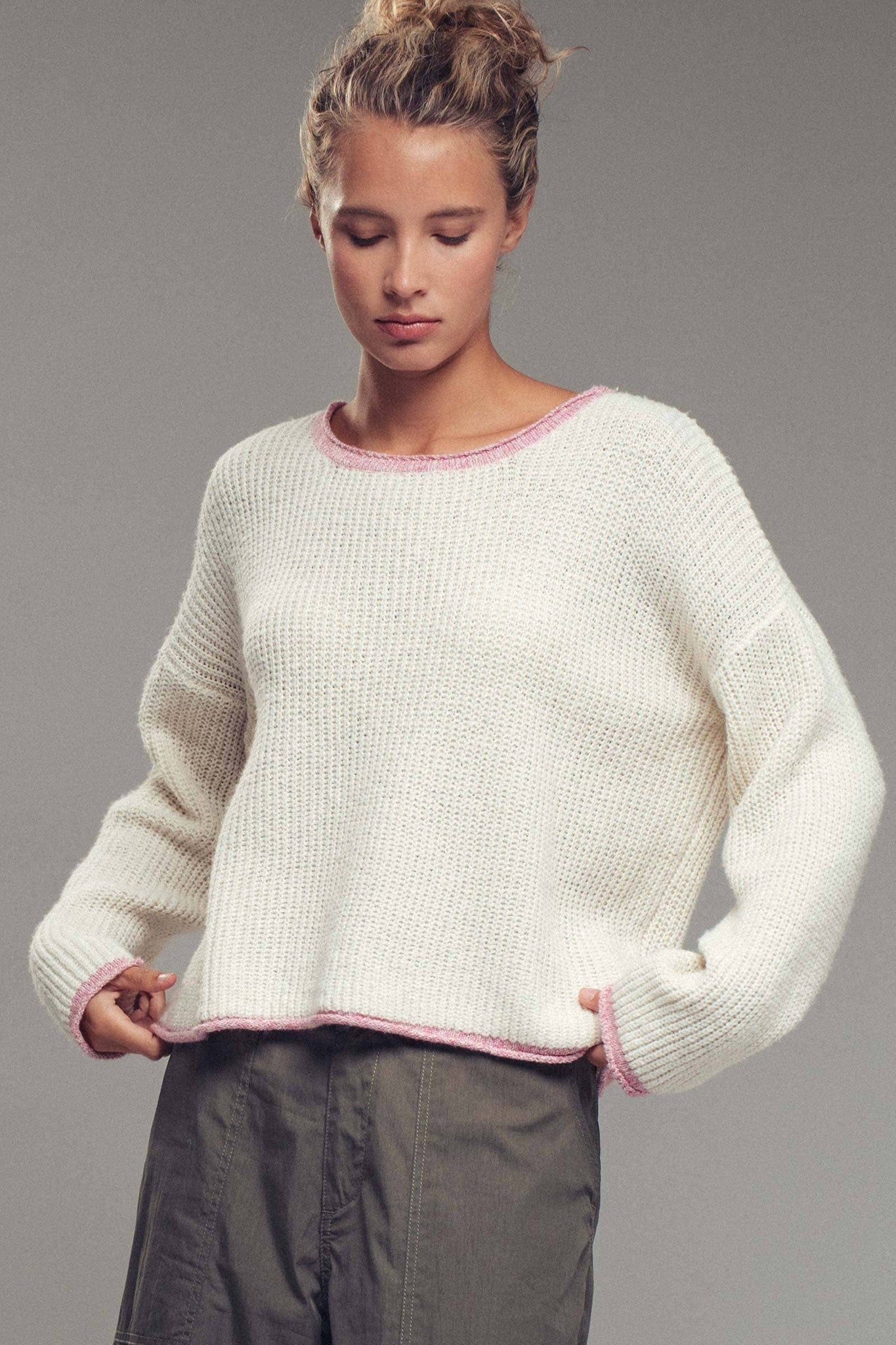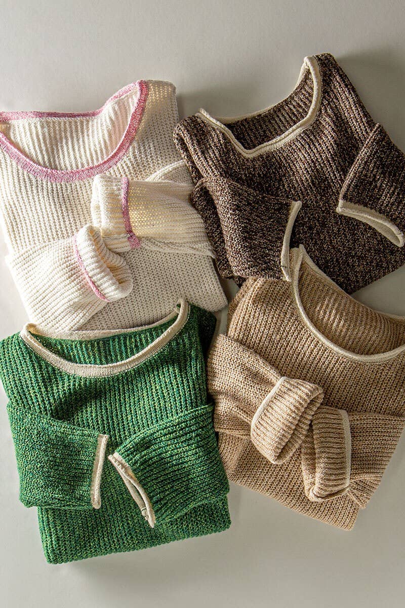A cozy knit sweater featuring contrast-bound edges for a stylish touch. Designed with a relaxed fit and soft polyester fabric, this sweater is perfect for layering during spring or casual outings. Features: • 100% Polyester • S-L: 2-2-2 • Contrast trim adds stylish detail • Relaxed fit for everyday comfort • Lightweight knit ideal for layering •