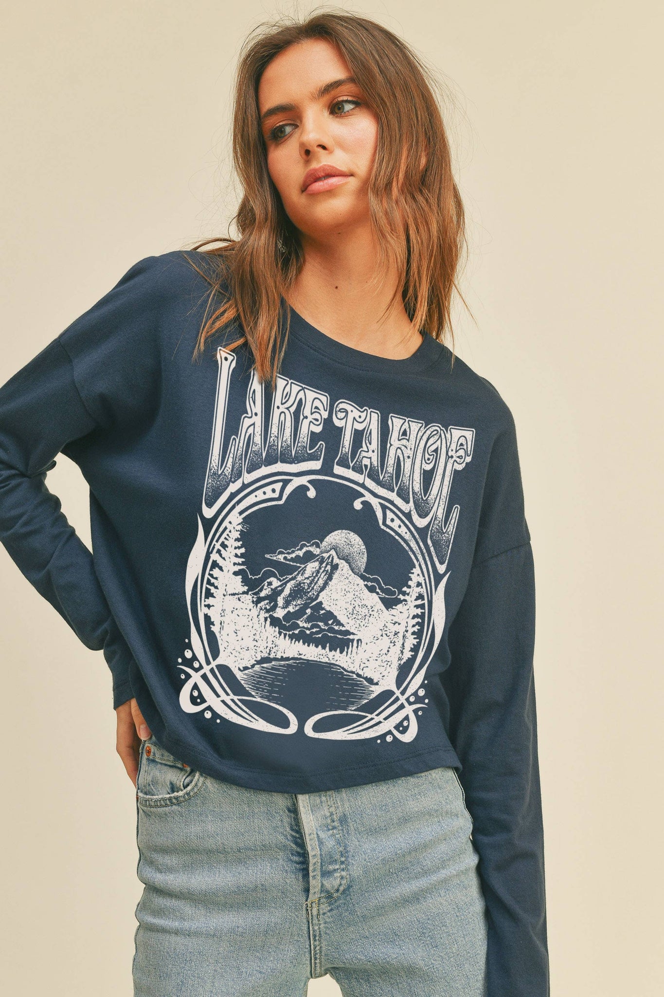Lake Tahoe Graphic Long Sleeve T-Shirt - 100% Cotton - 30 Singles Jersey - 150 GSM - Cropped Body Length - Tear Away Label or Printed Label - Made in Vietnam, Mexico or Bangladesh - Printed in USA *DTF PRINT *Colors may vary slightly due to the fabric lot process