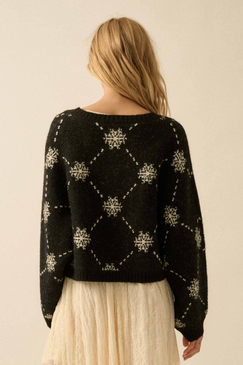 A jacquard-knit cardigan sweater with the following features: