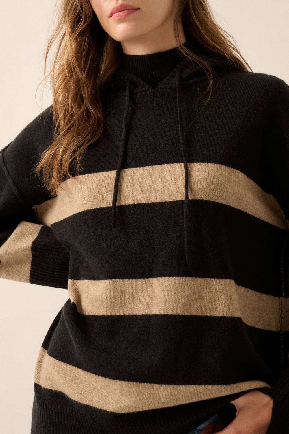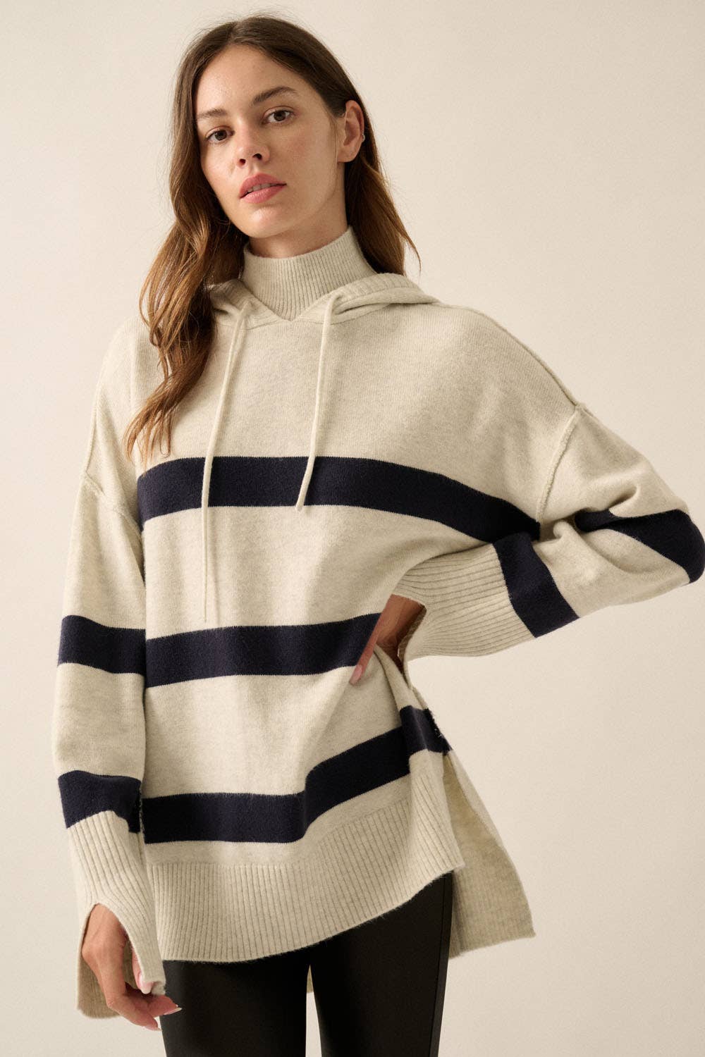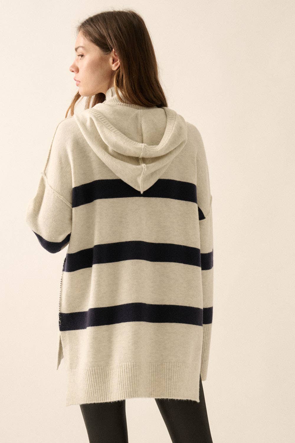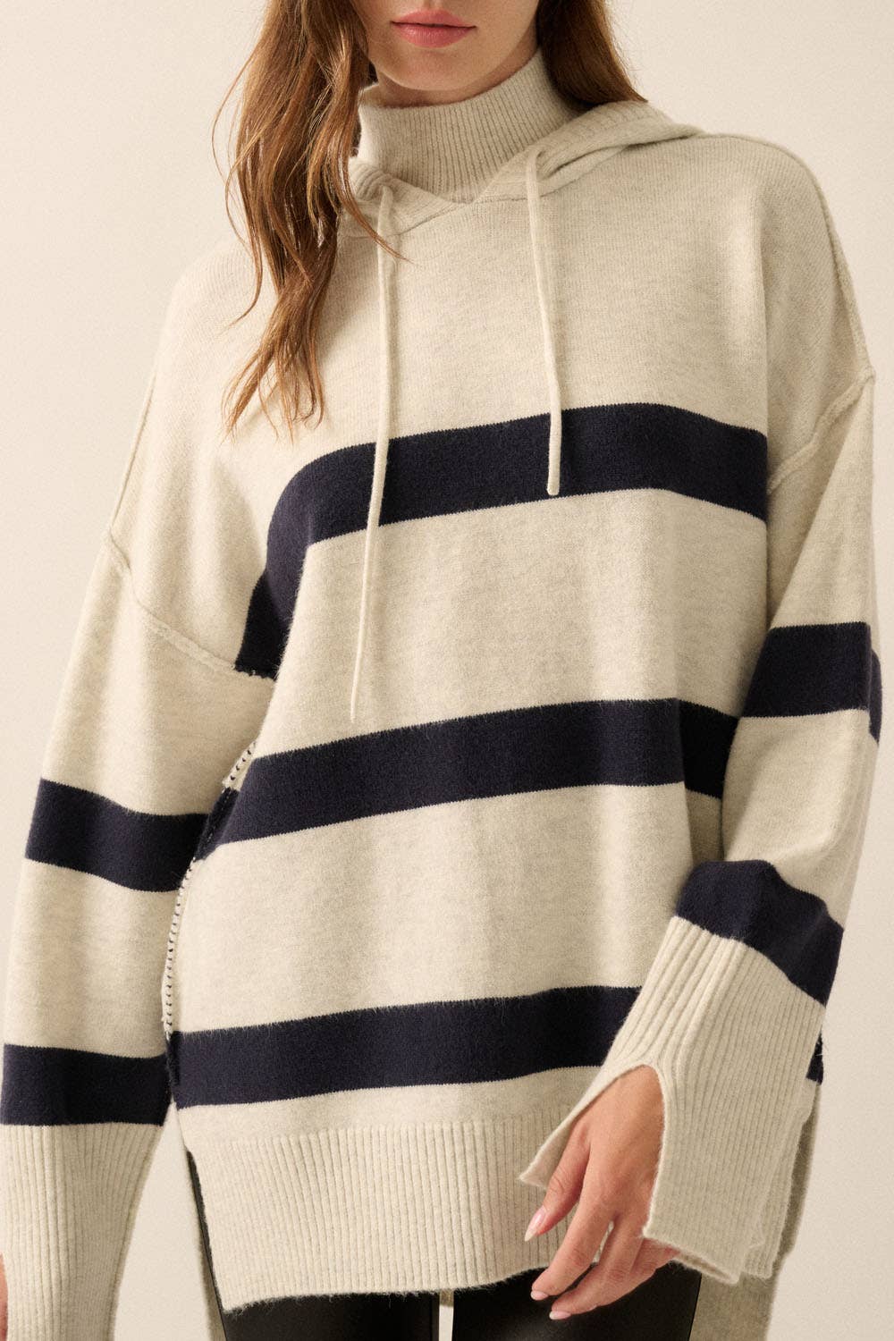 A striped knit sweater with the following features:  Drawstring hood. Long sleeves with split cuffs. Dropped shoulder. Exposed seams. High-low split hem. Thigh length. Loose fit. Model Info: Height: 5 ft 9 in | Bust: 31 in | Waist: 24 in | Hips: 34 in | Wearing Size S.